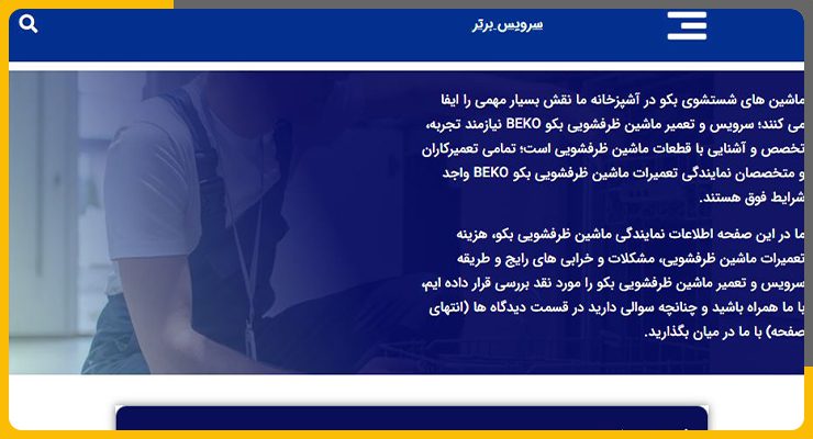 سرویس برتر شرکتی با بیش از ۱۵ سال تجربه در تهران است که خدمات نصب، سرویس و تعمیر ماشین ظرفشویی بکو را بهصورت در محل انجام میدهد. این شرکت از قطعات اصلی استفاده میکند و خدمات خود را با گارانتی ۳ تا ۱۲ ماه ارائه میدهد. هزینه تعمیر پس از عیبیابی طبق تعرفه مصوب اعلام میشود و اگر دستگاه در دوره گارانتی دچار مشکل شود، تعمیر مجدد رایگان خواهد بود.
