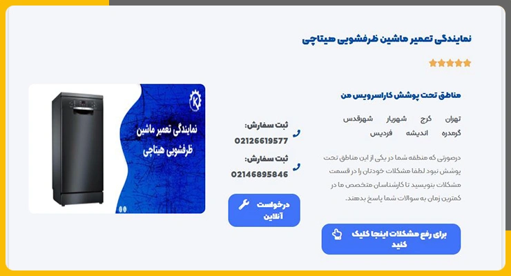 کارا سرویس من به عنوان نمایندگی تعمیر ماشین ظرفشویی هیتاچی در تهران فعالیت میکند. این مرکز با بهرهگیری از قطعات فابریک و اورجینال، خدمات تعمیر تخصصی انواع ماشینهای ظرفشویی هیتاچی را ارائه میدهد. یکی از خدمات متمایز این مرکز، تعمیر ماشین ظرفشویی در محل مشتری است که نیاز به حمل و نقل دستگاه را از بین میبرد. همچنین، تمامی خدمات ارائهشده دارای گارانتی ۳ تا ۶ ماهه هستند که اطمینان خاطر مشتریان را فراهم میکند. کارا سرویس من مناطق گستردهای از جمله تهران، کرج، شهریار، شهرقدس، گرمدره، اندیشه و فردیس را تحت پوشش خدمات خود قرار داده است.