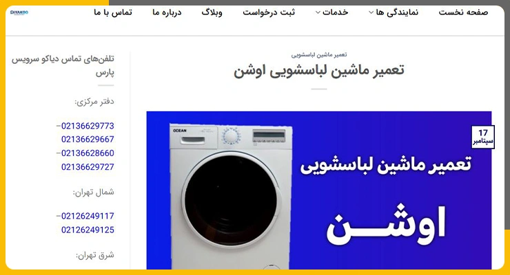 سایت دیاکو سرویس پارس نمایندگی تعمیر ماشین لباسشویی اوشن در تهران است و خدماتی مانند سرویس، عیبیابی و تعمیر دستگاه را مستقیماً در محل ارائه میدهد. این مرکز با تیمی از تکنسینهای حرفهای و استفاده از قطعات اصلی، مشکلات رایج دستگاه مثل روشن نشدن، تخلیه نکردن آب یا لرزش بیش از حد را رفع میکند و خدمات شبانهروزی در سراسر تهران ارائه میدهد.